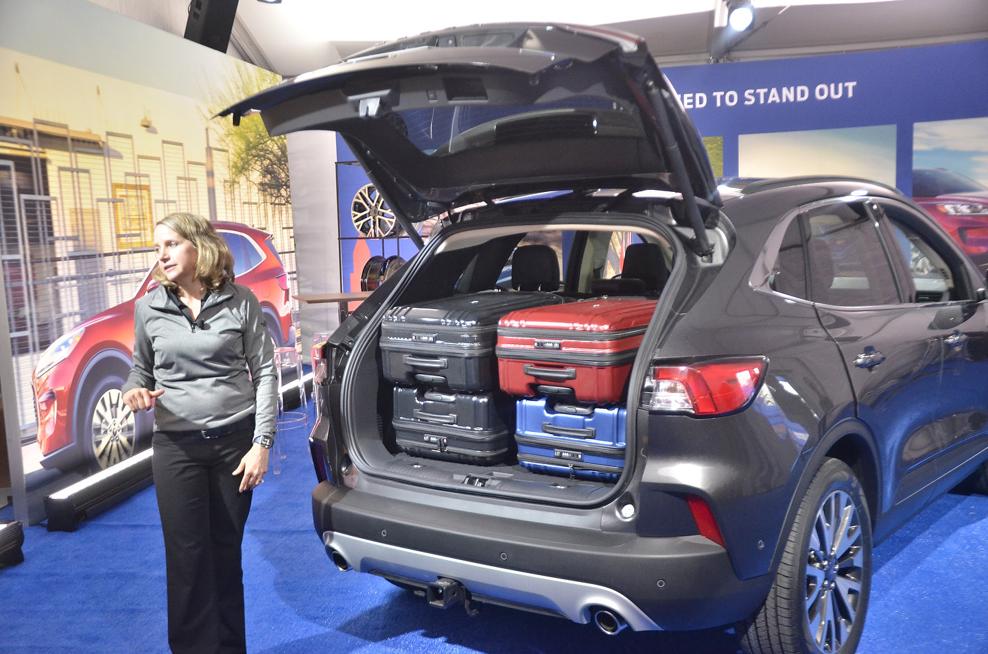 À l’intérieur, il faudra bien sûr passer du temps à conduire le véhicule pour en arriver à des conclusions plus précises et détaillées, mais on peut déjà saluer l’ajout de sièges coulissants (sur 15 cm) à la deuxième rangée, du moins sur les variantes à moteurs EcoBoost. Ford affirme fièrement que le nouvel Escape offrira plus d’espace que tout autre concurrent à cet endroit. Et, conséquemment, lorsque la banquette sera poussée vers l’avant, le volume libéré à l’arrière va augmenter les possibilités en matière de chargement. Ford promet que quatre sacs de golf pourront être glissés derrière.