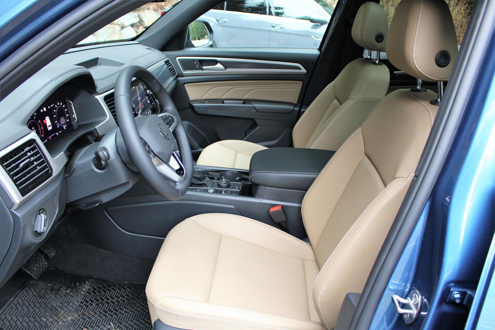 À l’avant, il y a très peu d’indices démontrant que l’on prend place dans l’Atlas à cinq places plutôt que la version à six ou à sept passagers. Bon, il y a quelques différences, comme le nouveau volant arborant le logo épuré de la marque – le Cross Sport est le premier modèle en Amérique du Nord à en bénéficier – ainsi que des coutures uniques sur les panneaux de porte et des garnitures distinctes sur les sièges. Mais c’est à peu près tout. Le Volkswagen Atlas 2021, récemment révélé aux salons de Chicago et de Toronto, obtiendra certaines de ces améliorations aussi.